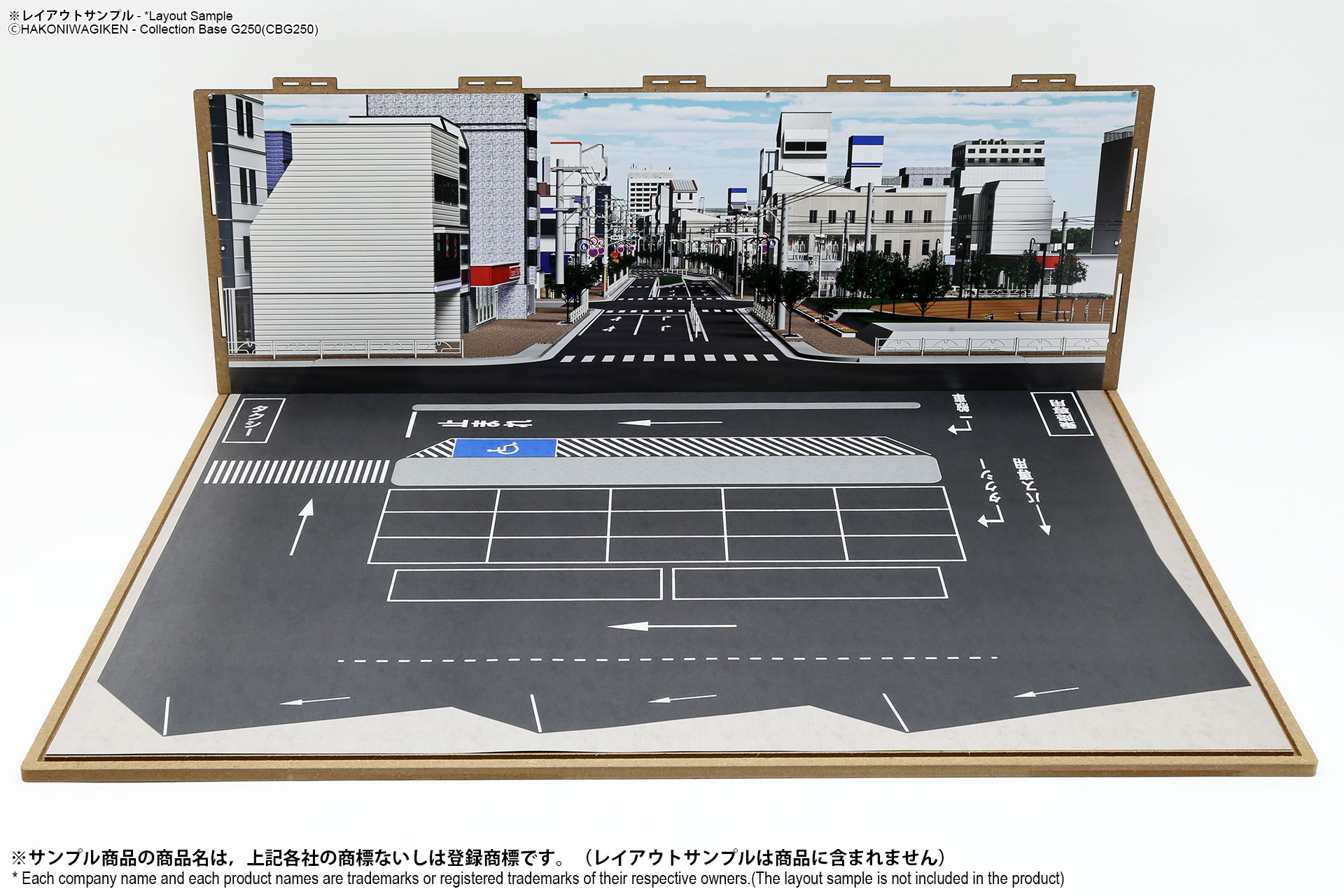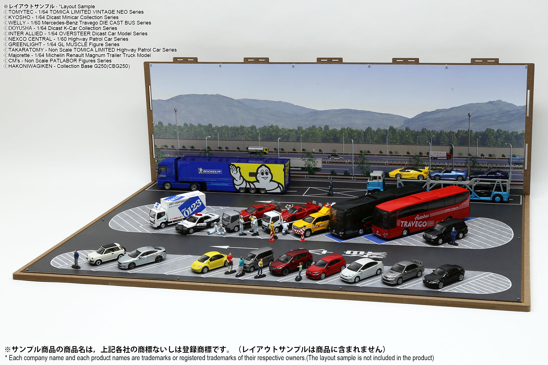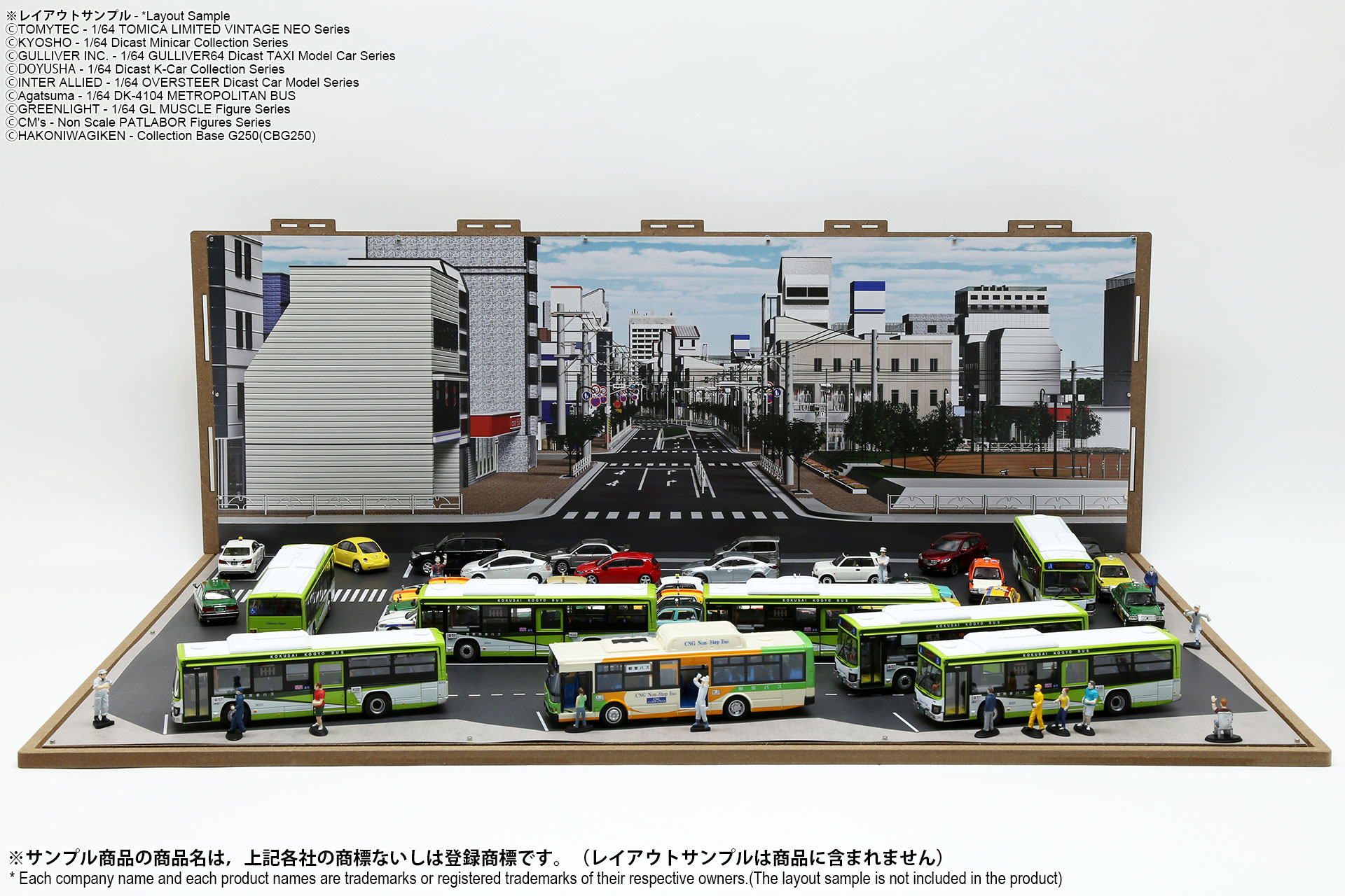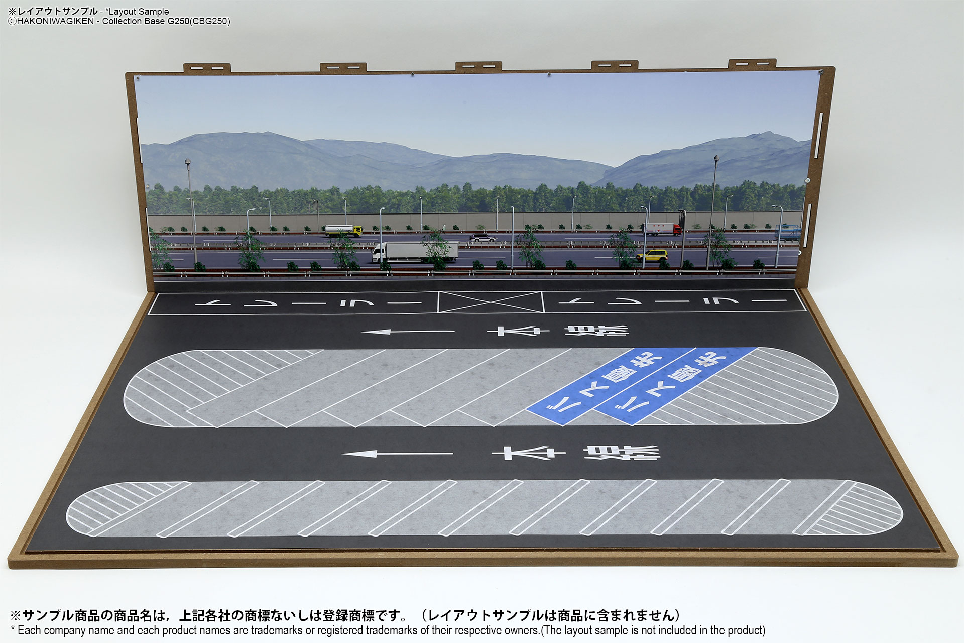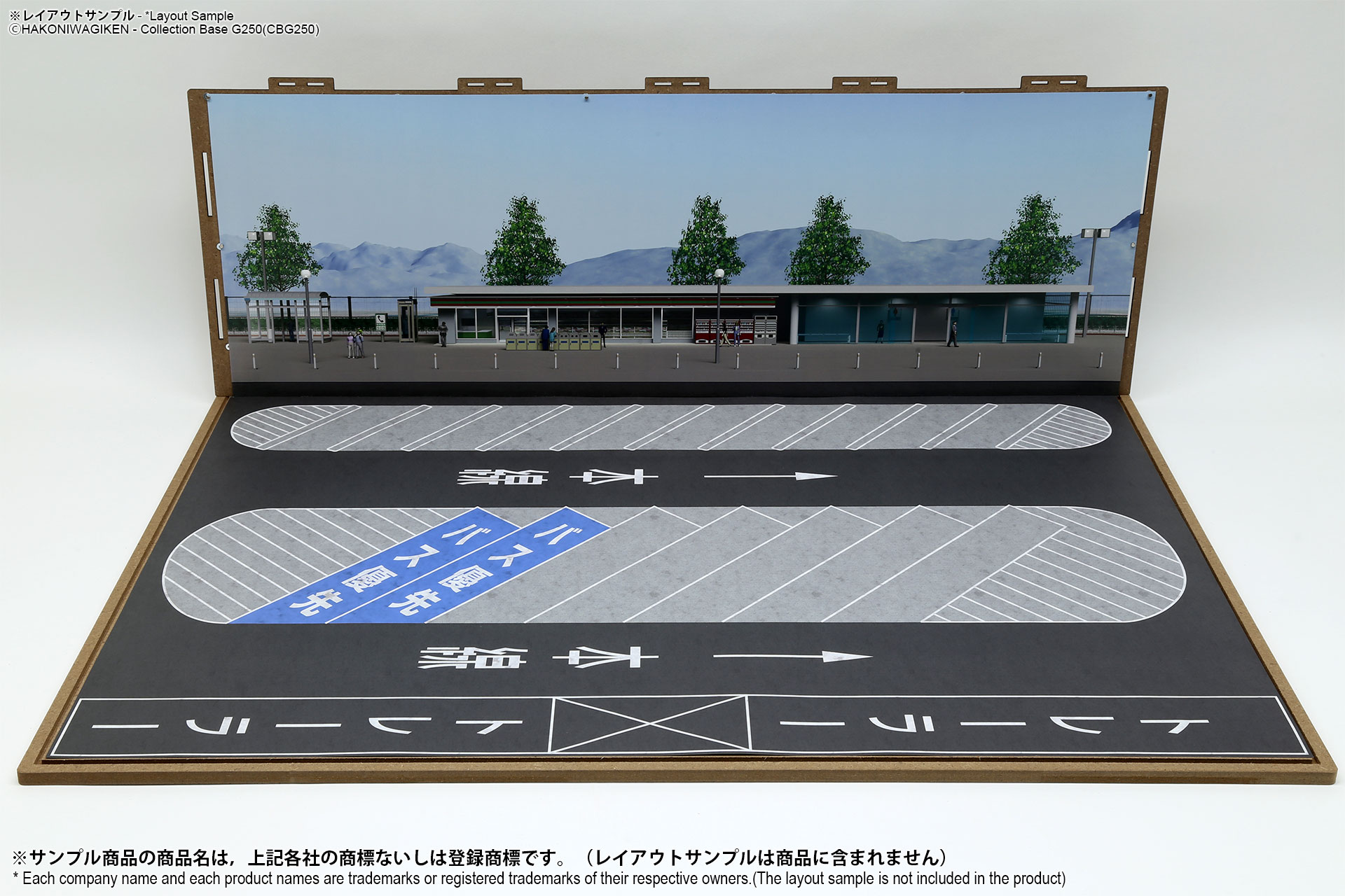 ベース表面は駅前ターミナル、ベース裏面はSA/PAの2パターンが印刷されたHGタイプのシート1枚と、前後2パターンの厚口マットコート紙タイプの背景シート4パターンが付属した1/64スケール対応のジオラマシートG250タイプです。ベースシートと背景シートの組み合わせで、4パターンからお好みで選んでご利用いただけます。ベースシートは耐久性向上と反射防止効果を備えたマットPPコーティングのHGタイプを採用しております。専用のコレクションベースG250に対応しますが、シート単独でもご自分で背景シートを固定することでご利用可能です。 |