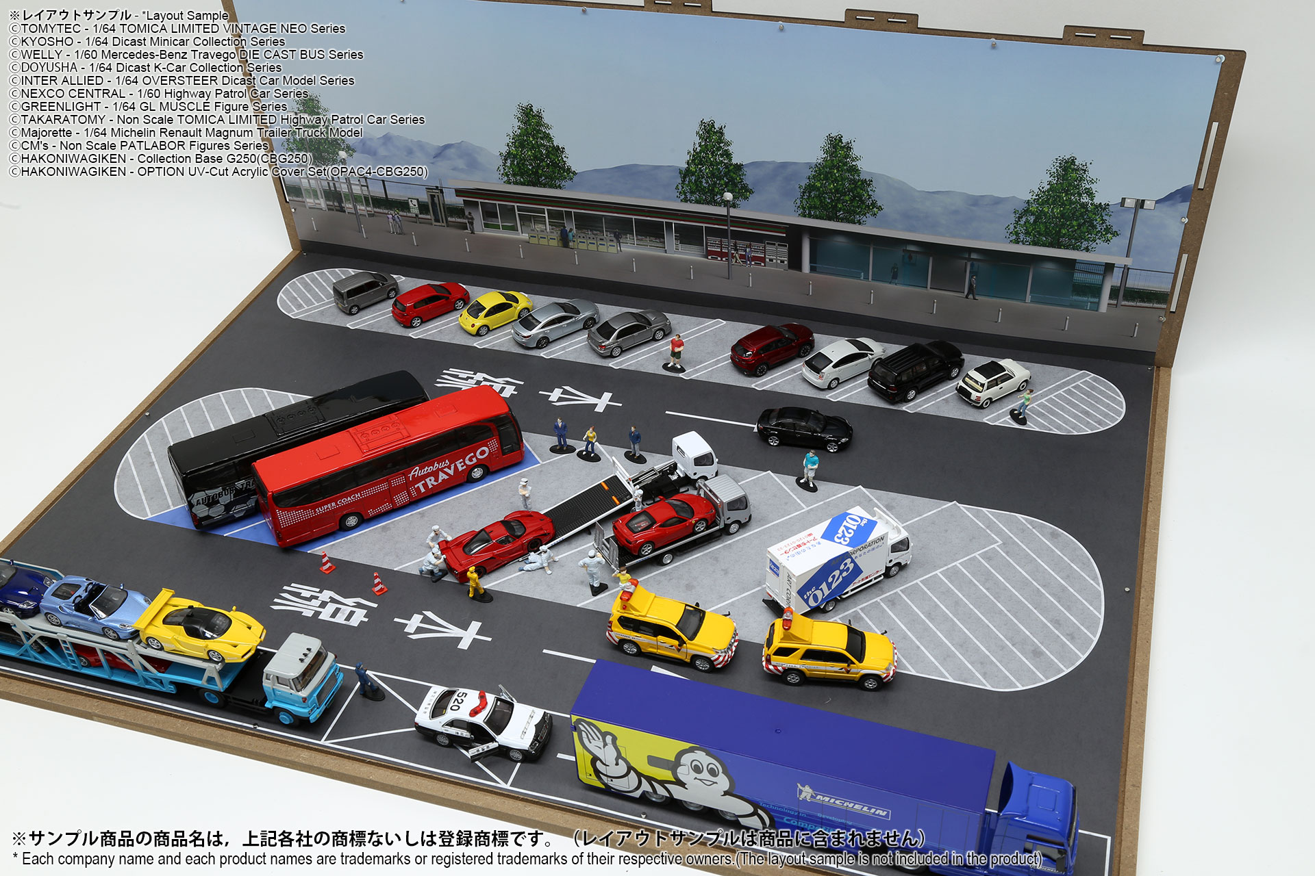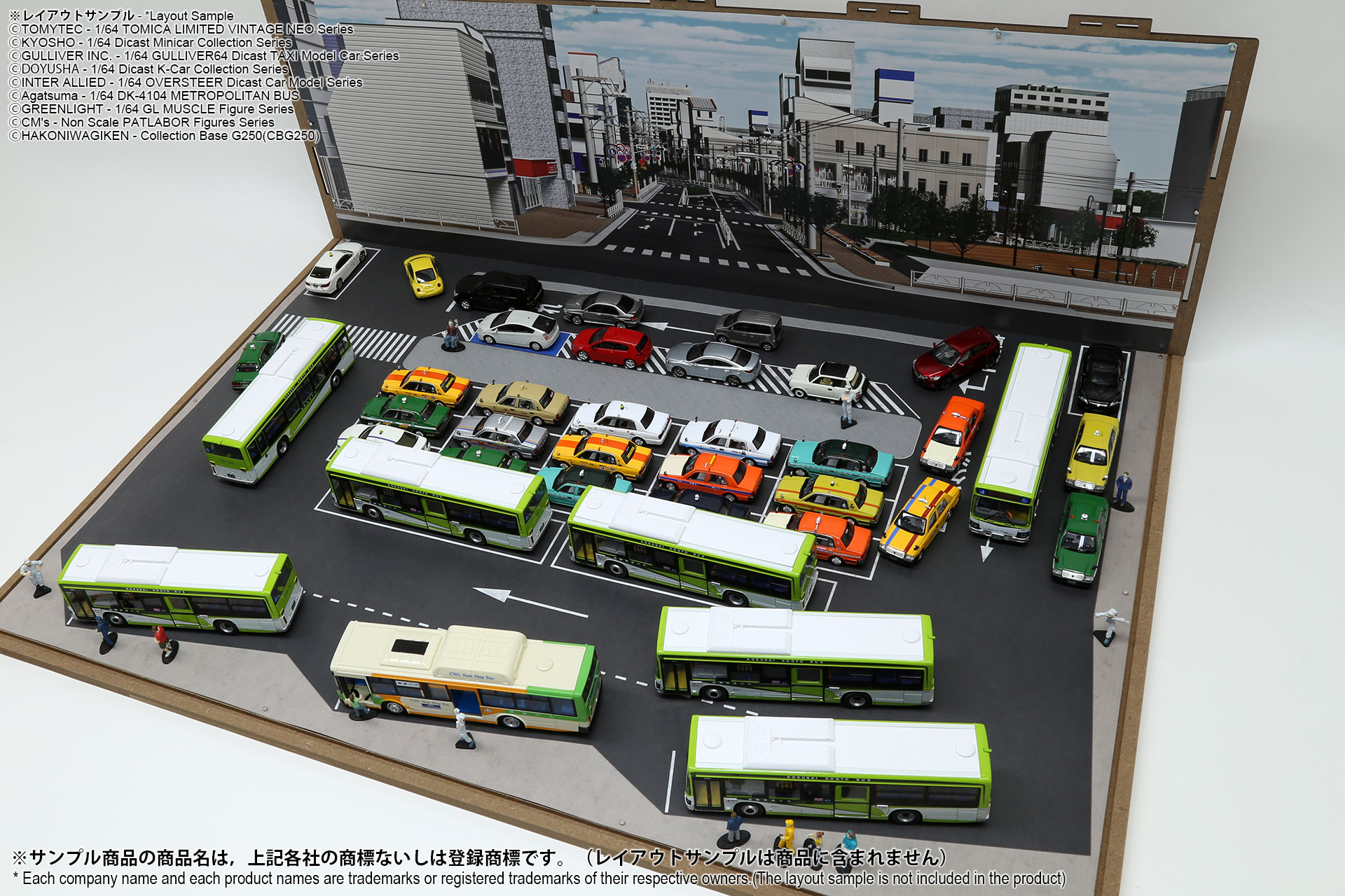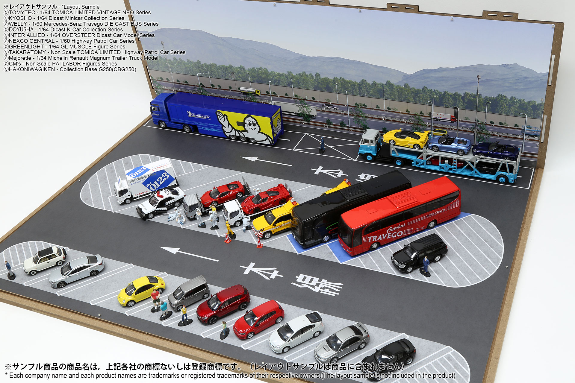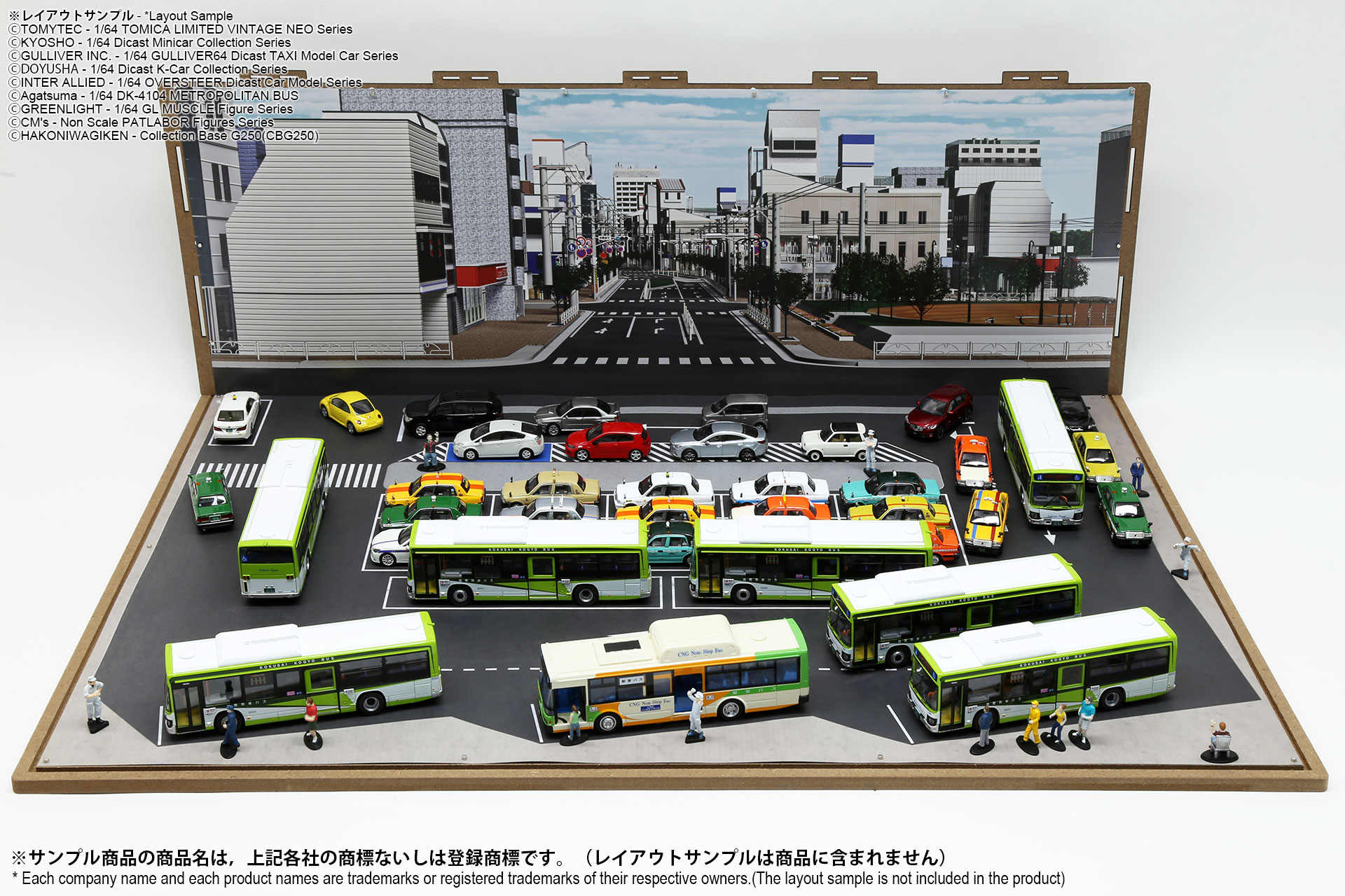 ベース表面は駅前ターミナル、ベース裏面はSA/PAの2パターンが印刷されたHGタイプのシート1枚と、前後2パターンの厚口マットコート紙タイプの背景シート4パターンが付属した1/64スケール対応のジオラマシートG250タイプです。ベースシートと背景シートの組み合わせで、4パターンからお好みで選んでご利用いただけます。ベースシートは耐久性向上と反射防止効果を備えたマットPPコーティングのHGタイプを採用しております。専用のコレクションベースG250に対応しますが、シート単独でもご自分で背景シートを固定することでご利用可能です。 |