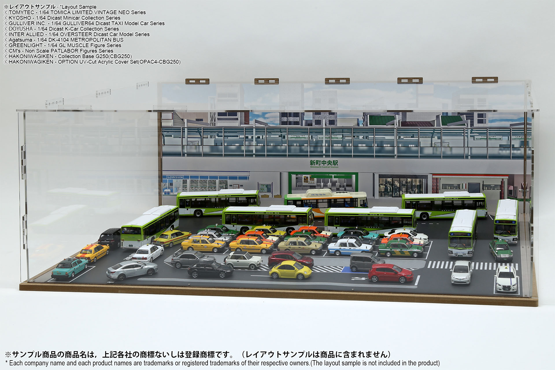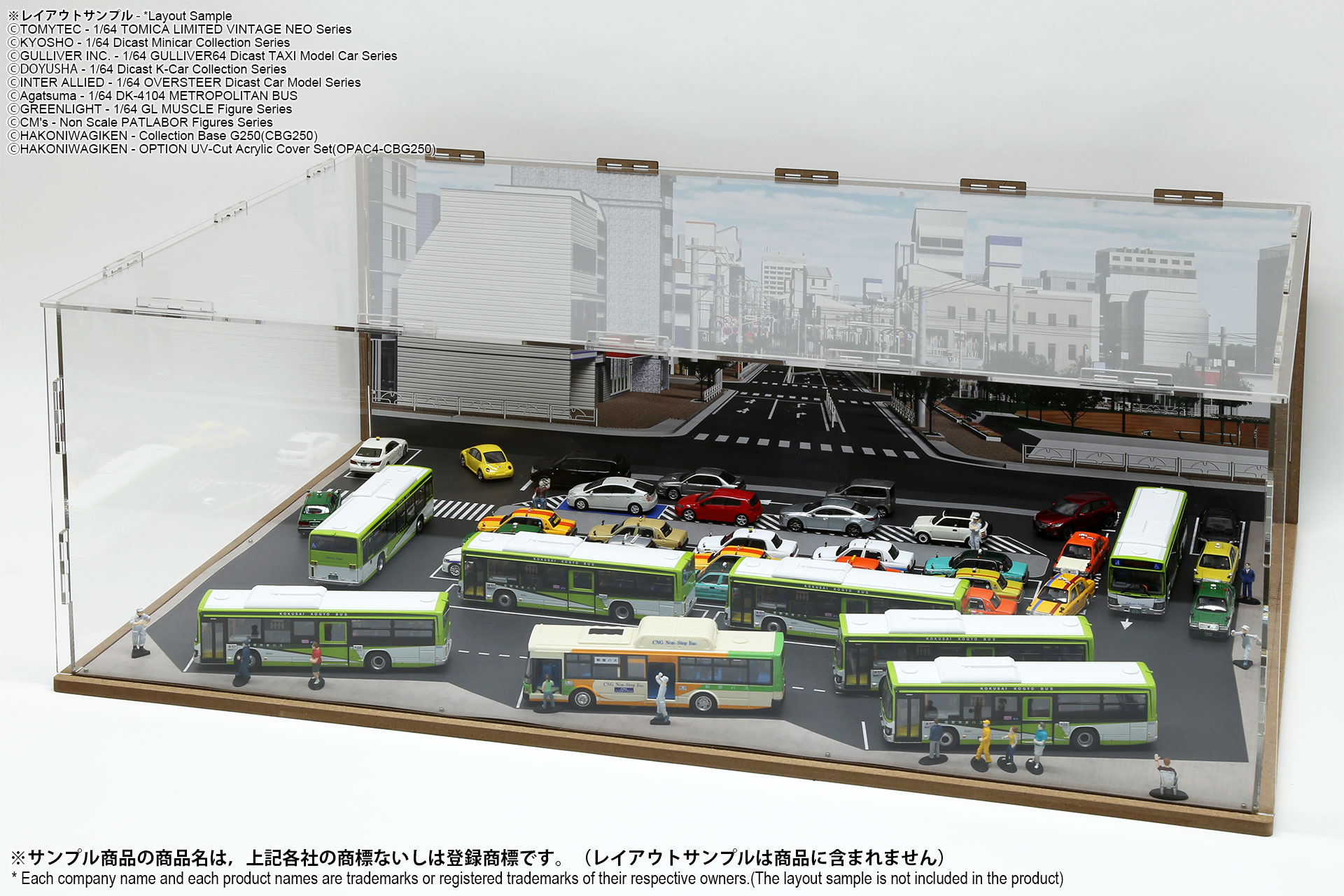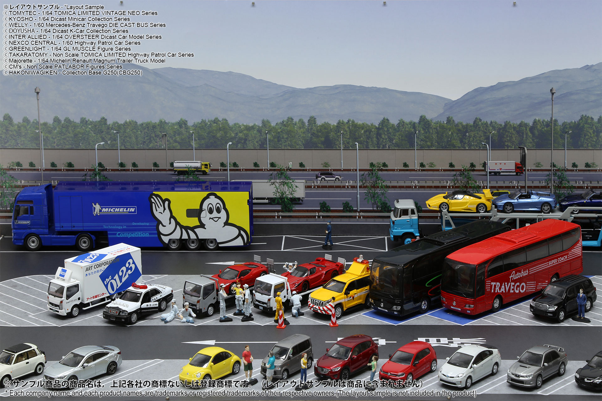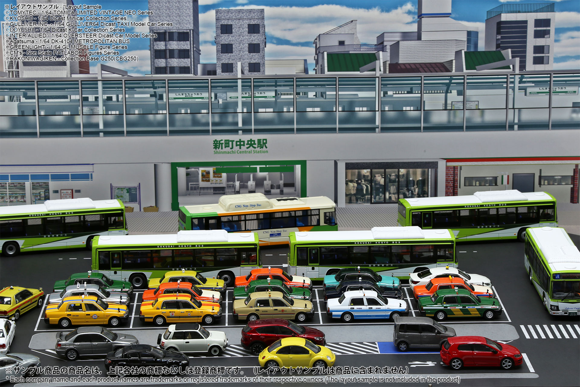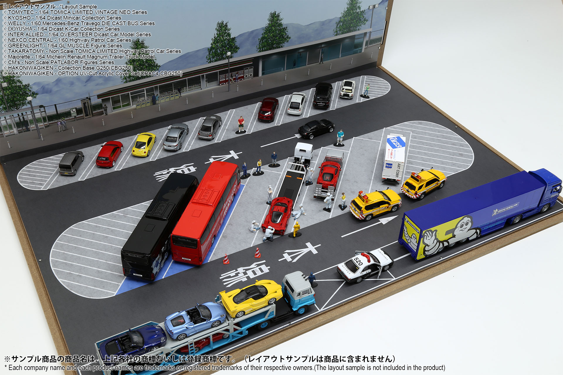 ベース表面は駅前ターミナル、ベース裏面はSA/PAの2パターンが印刷されたHGタイプのシート1枚と、前後2パターンの厚口マットコート紙タイプの背景シート4パターンが付属した1/64スケール対応のジオラマシートG250タイプです。ベースシートと背景シートの組み合わせで、4パターンからお好みで選んでご利用いただけます。ベースシートは耐久性向上と反射防止効果を備えたマットPPコーティングのHGタイプを採用しております。専用のコレクションベースG250に対応しますが、シート単独でもご自分で背景シートを固定することでご利用可能です。 |