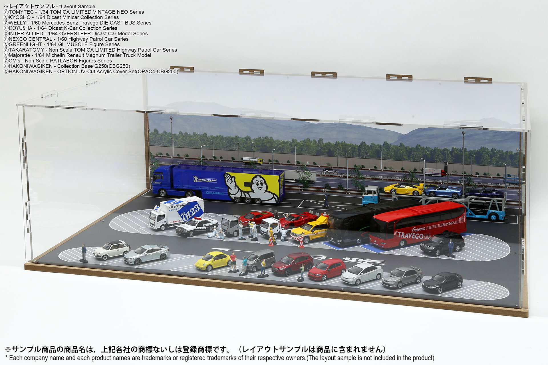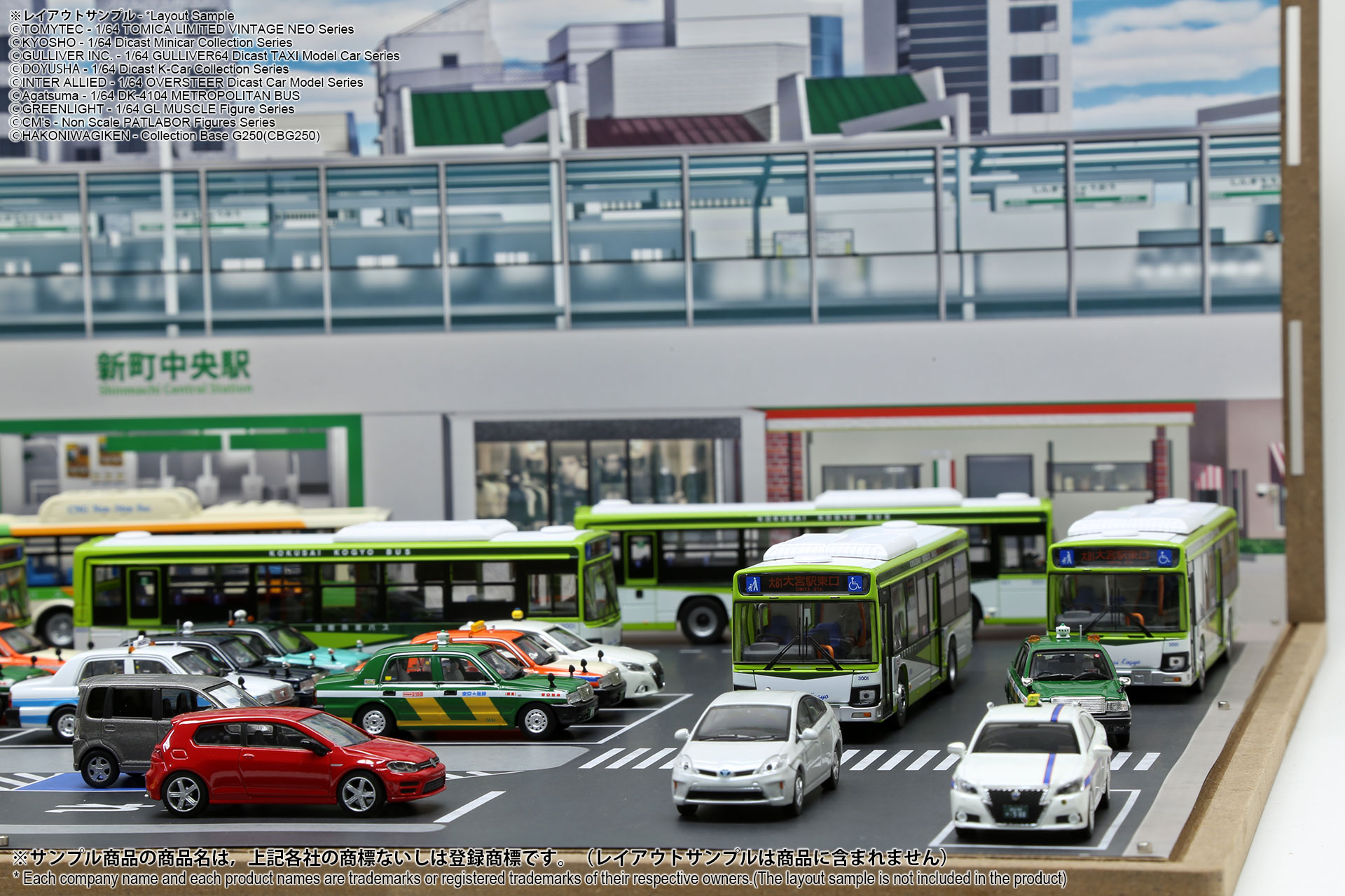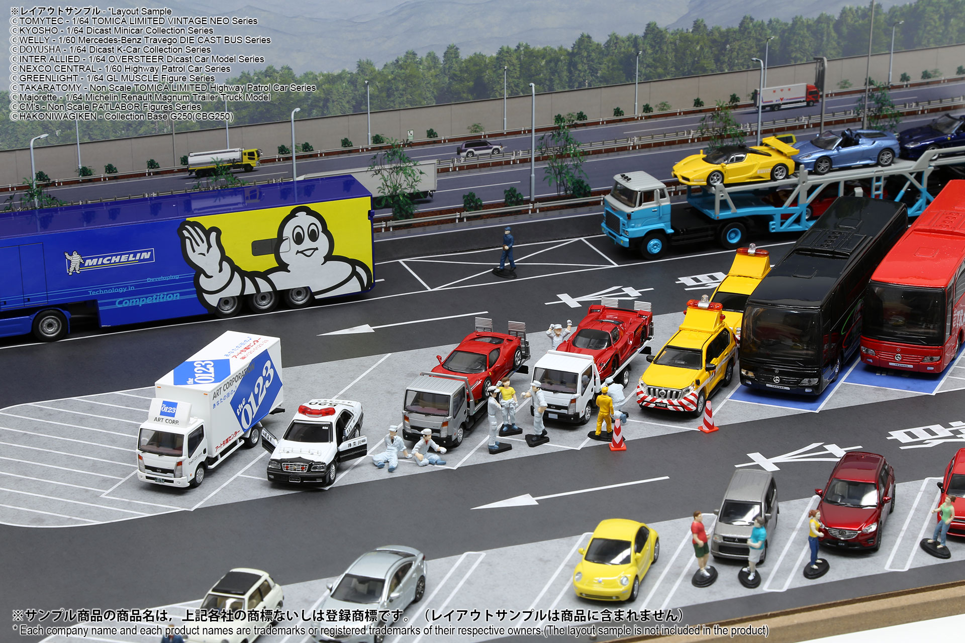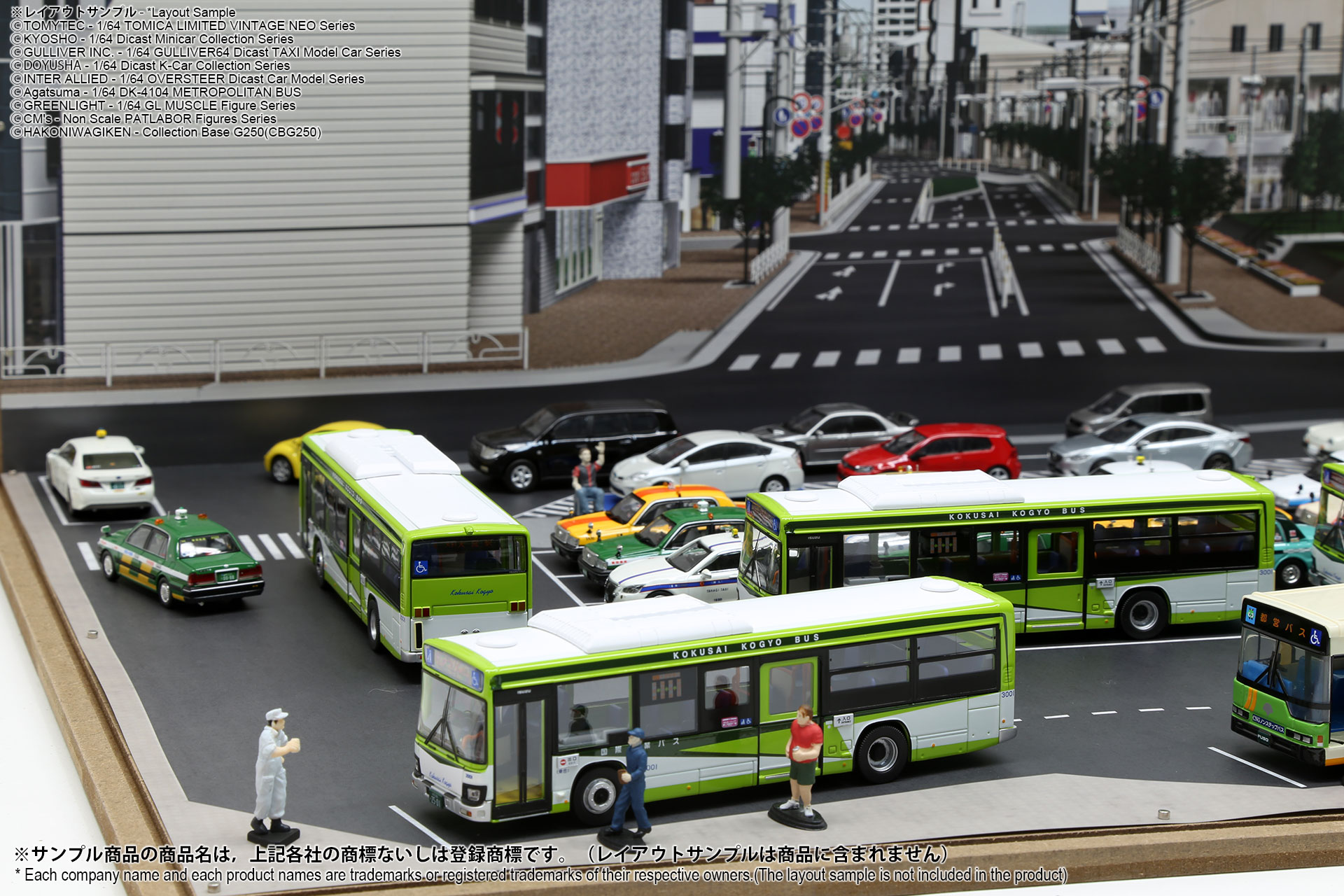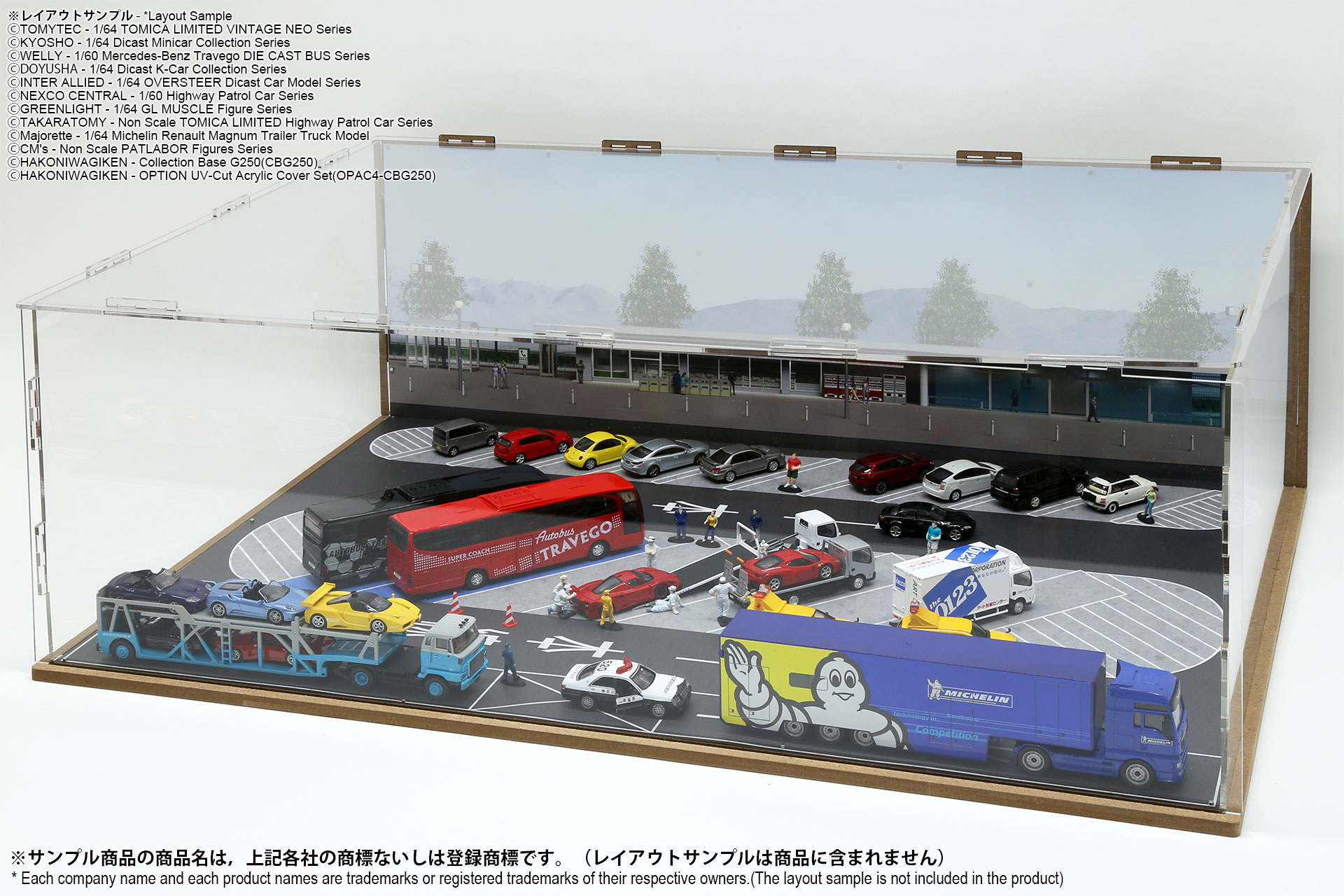 ベース表面は駅前ターミナル、ベース裏面はSA/PAの2パターンが印刷されたHGタイプのシート1枚と、前後2パターンの厚口マットコート紙タイプの背景シート4パターンが付属した1/64スケール対応のジオラマシートG250タイプです。ベースシートと背景シートの組み合わせで、4パターンからお好みで選んでご利用いただけます。ベースシートは耐久性向上と反射防止効果を備えたマットPPコーティングのHGタイプを採用しております。専用のコレクションベースG250に対応しますが、シート単独でもご自分で背景シートを固定することでご利用可能です。 |