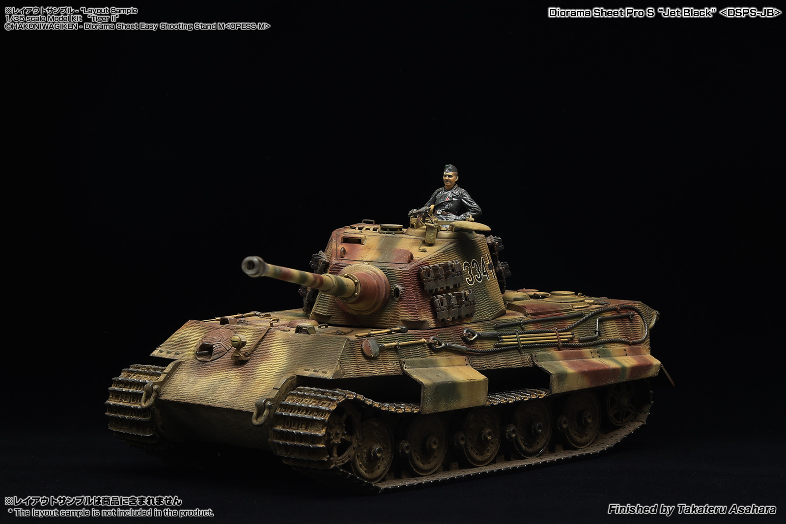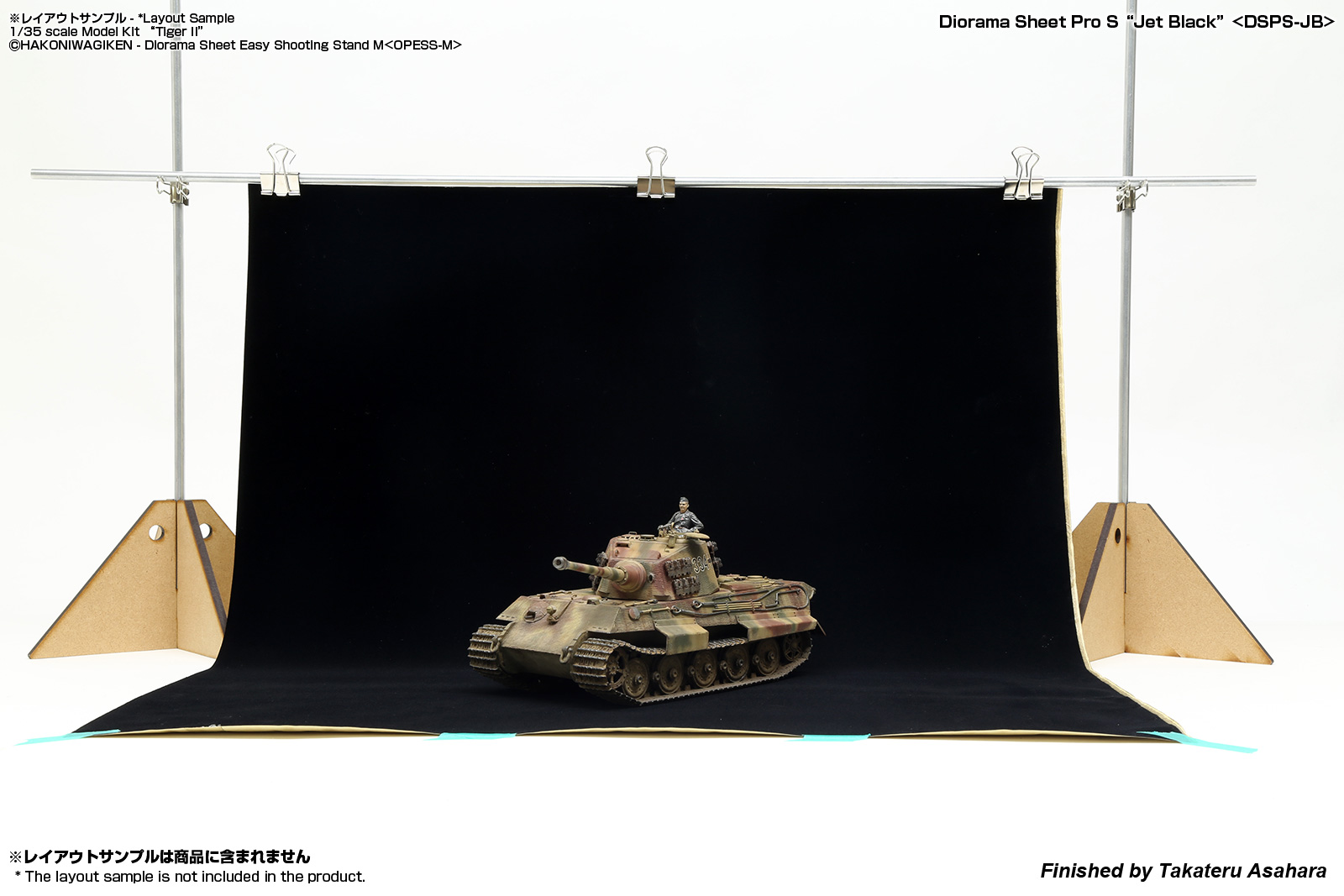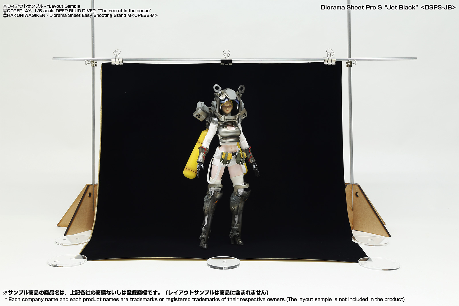 非常にご要望の多かった超無反射の黒背景シートを商品化いたします。サイズは約520x600mmとなります。ホコリ一つ付着しても目立ってしまう漆黒のシートですので、撮影時には粘着テープやコロコロの粘着面でホコリなどを除去してからお楽しみください。撮影には別売のジオラマシート簡易撮影スタンドM(OPESS-M)をご利用いただくと便利です。