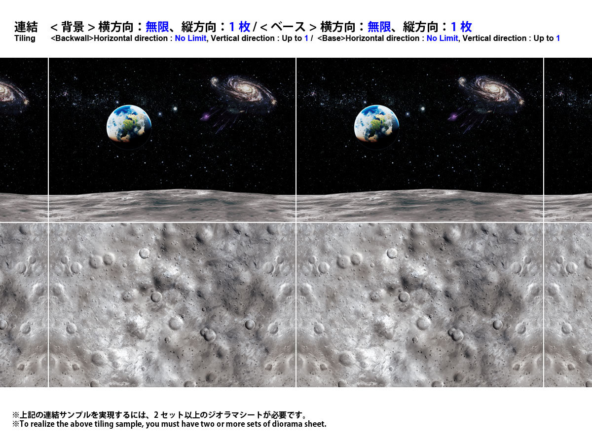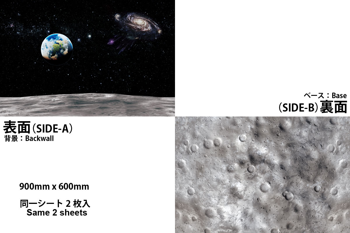 惑星地表面でのMSなどの宇宙戦闘シーンや、宇宙船などの宇宙空間飛行シーンなどで利用できる地表ベースと宇宙背景がセットになった商品です。比較対象となるスケールが宇宙空間のものとなるため、各種スケールに柔軟に対応可能です。ベース&背景の同一シート2枚入りです。 |