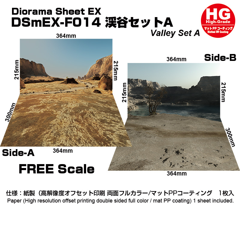 コレクションベースEXシリーズで利用可能なジオラマシートEXシリーズの渓谷セットAです。対応ベースは別売となります。マットPPコーティングで反射防止と耐久性を向上させたHGタイプの両面印刷1枚組で、2パターンが楽しめます。コレクションベースに設置して利用する際は、背景とベース部分の境界でカットしてご利用いただくと便利です。コレクションベースに付属の極小固定マグネットを利用して、簡単に設置が可能です。お気に入りのシーンが完成したら、別売のUVカットアクリルカバーで紫外線・ホコリから展示物を守る高機能なディスプレイケースへ発展可能です。 |