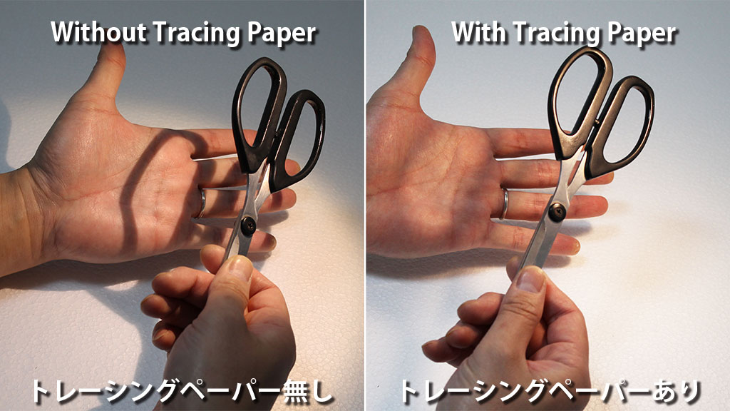 デフューザーを使うと、コントラストが抑えられて、写真の写りがワンラックアップしたような感じになります。人間の目に比べてカメラのダイナミックレンジ(識別可能な明るさの最小値と最大値の比率)は低いため、人間の目では認識できる影の部分のディテールがカメラで撮った写真になると黒くつぶれて認識できない、というケースが良くあります。そういった写真は「いかにも簡単に写真で撮りました」という感じのイメージになってしまいがちです。トレーシングペーパーを使用してデフューザーとすることでコントラストが抑えられ、影の部分のディテールも認識できるために、より人間の目で見た感じに近い自然な画像となるため、「きれいな写真だな」と感じやすくなります。 |