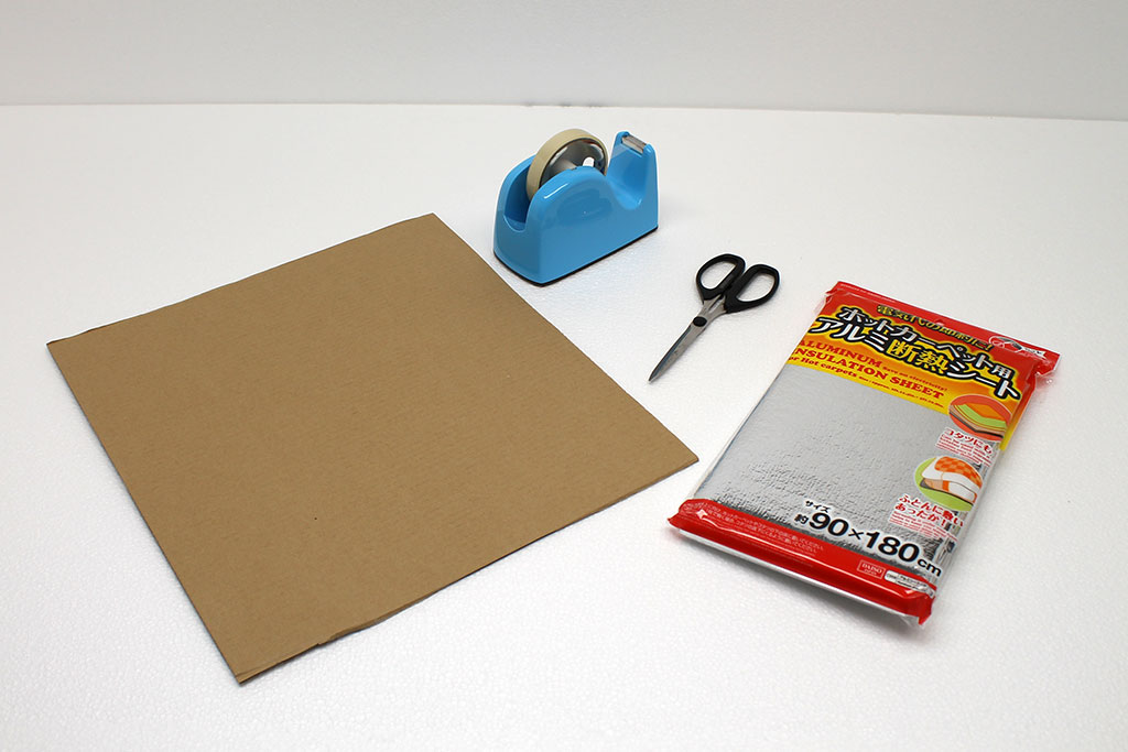 板段ボールを包むようにして断熱シートをテープで留めるだけで簡単に完成します。 |
