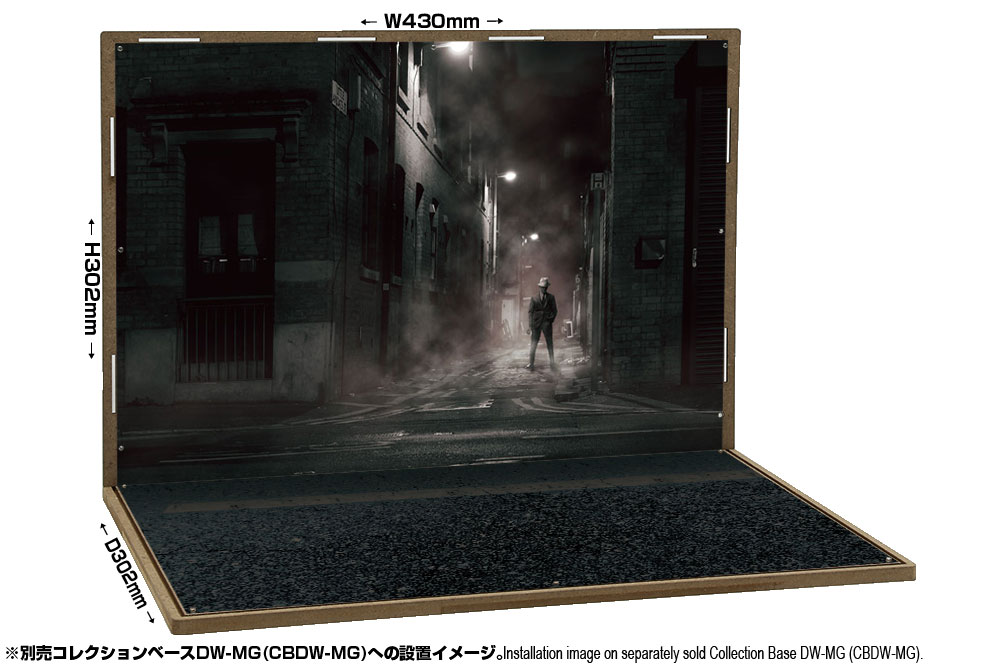 コレクションベースDW(DW-MG)で利用可能なジオラマシートDWシリーズの都市セットBです。目安として1/12〜1/6サイズのフィギュアでお楽しみいただけ、余裕あるサイズを生かして1/12〜1/8などのサイズでは立体的な展示ディスプレイも可能です。対応ベースは別売となります。両面印刷2枚組で、表と裏がそれぞれベースと背景になっており、1パターンが楽しめます。コレクションベースに付属の極小固定マグネットを利用して、簡単に設置が可能です。お気に入りのシーンが完成したら、別売のUVカットアクリルカバーで紫外線・ホコリから展示物を守る高機能なディスプレイケースへ発展可能です。材質はこれまでの従来のジオラマシート同様のノーマルタイプで、コーティング無しとなります。 |
