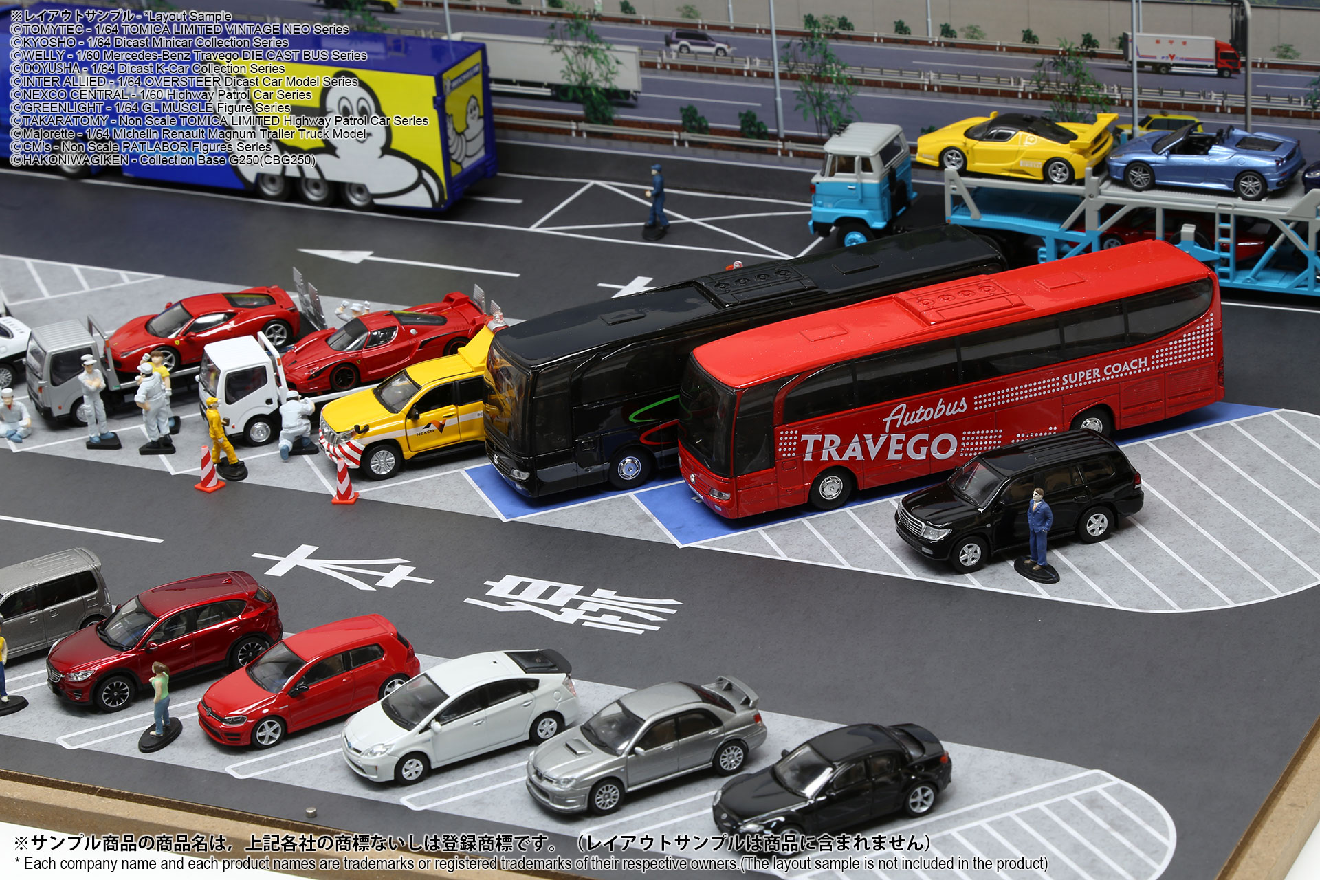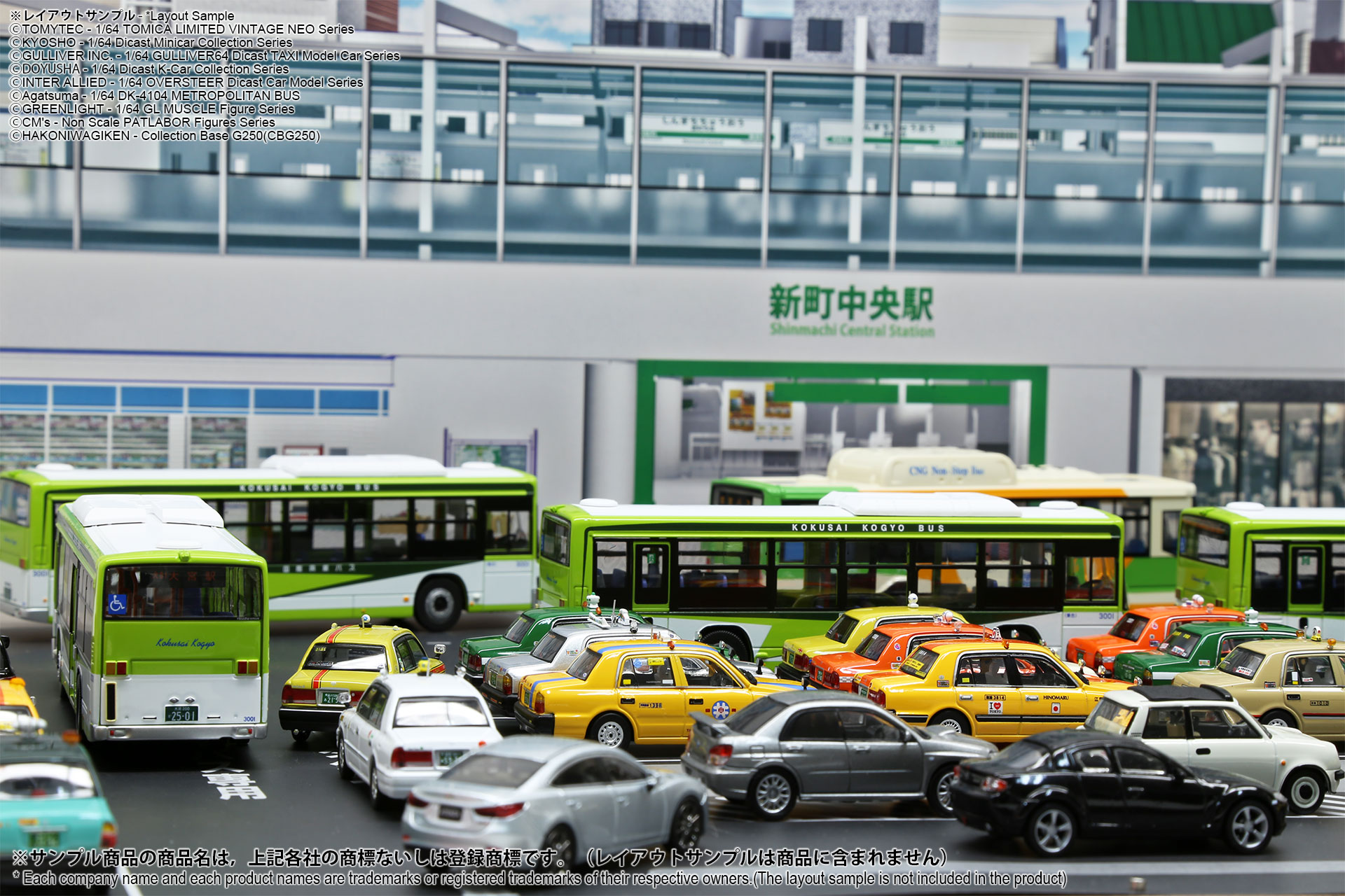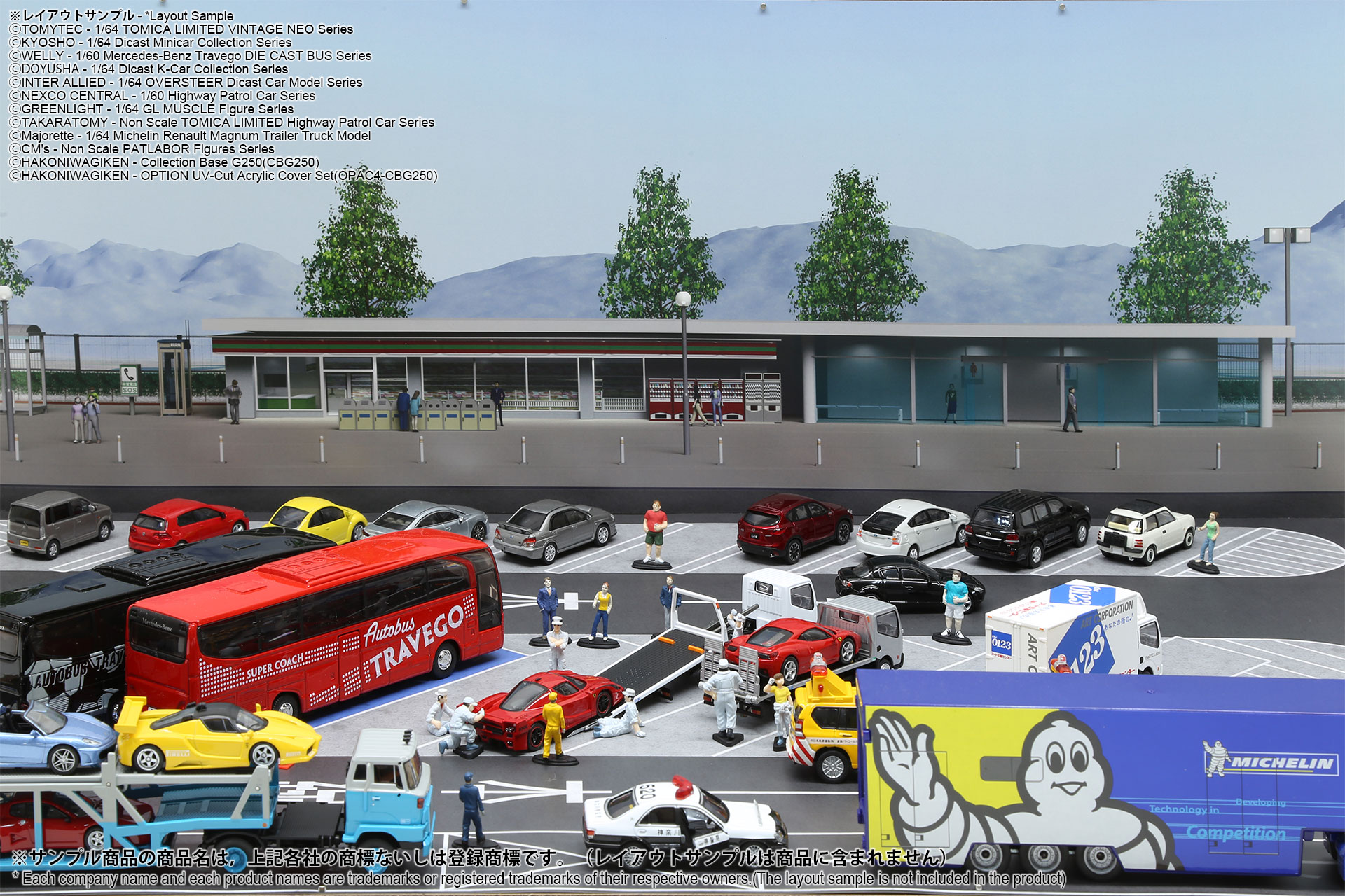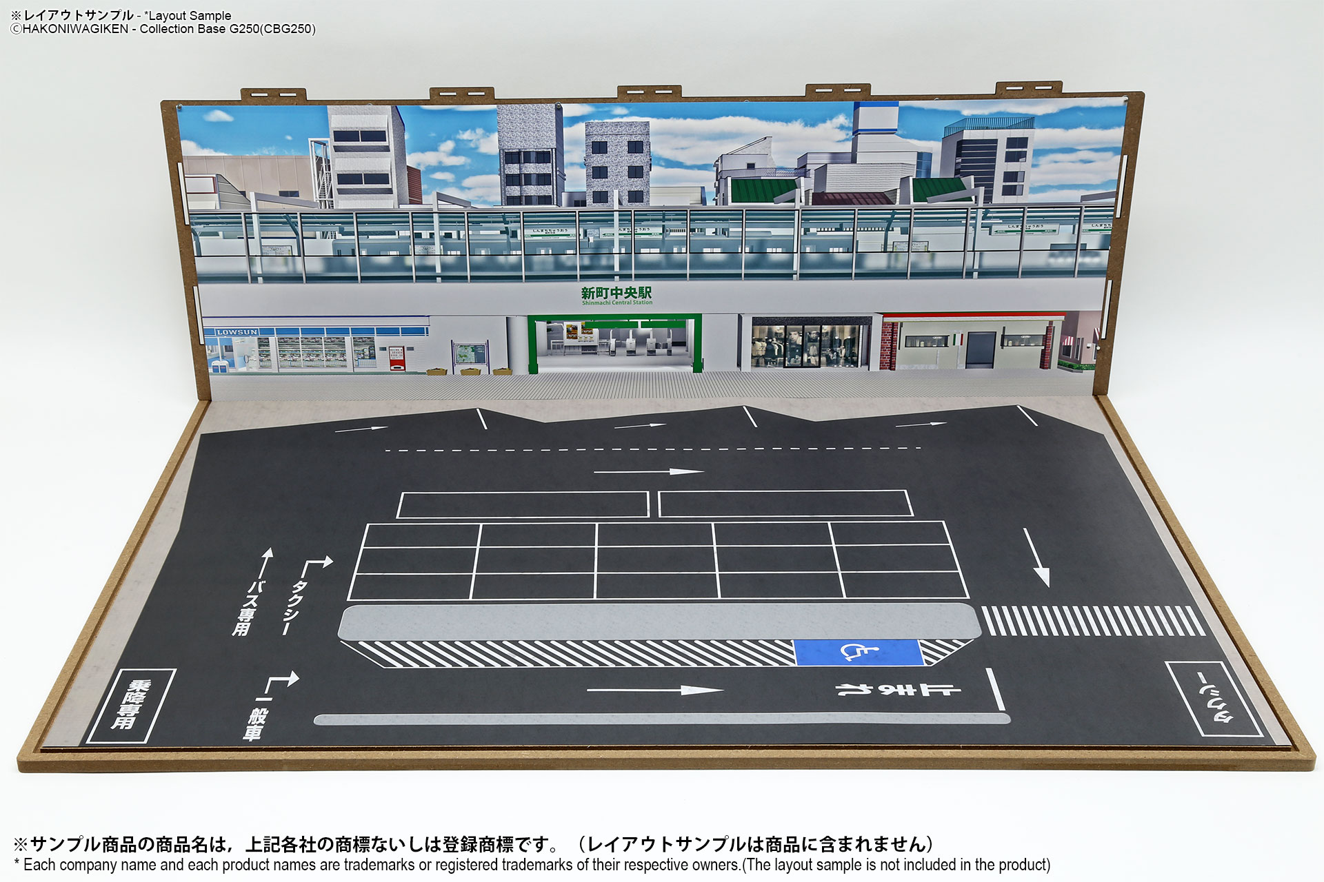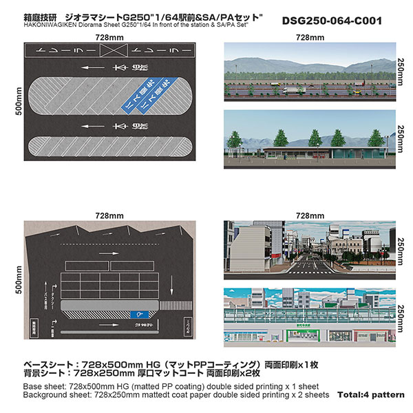ベース表面は駅前ターミナル、ベース裏面はSA/PAの2パターンが印刷されたHGタイプのシート1枚と、前後2パターンの厚口マットコート紙タイプの背景シート4パターンが付属した1/64スケール対応のジオラマシートG250タイプです。ベースシートと背景シートの組み合わせで、4パターンからお好みで選んでご利用いただけます。ベースシートは耐久性向上と反射防止効果を備えたマットPPコーティングのHGタイプを採用しております。専用のコレクションベースG250に対応しますが、シート単独でもご自分で背景シートを固定することでご利用可能です。 |