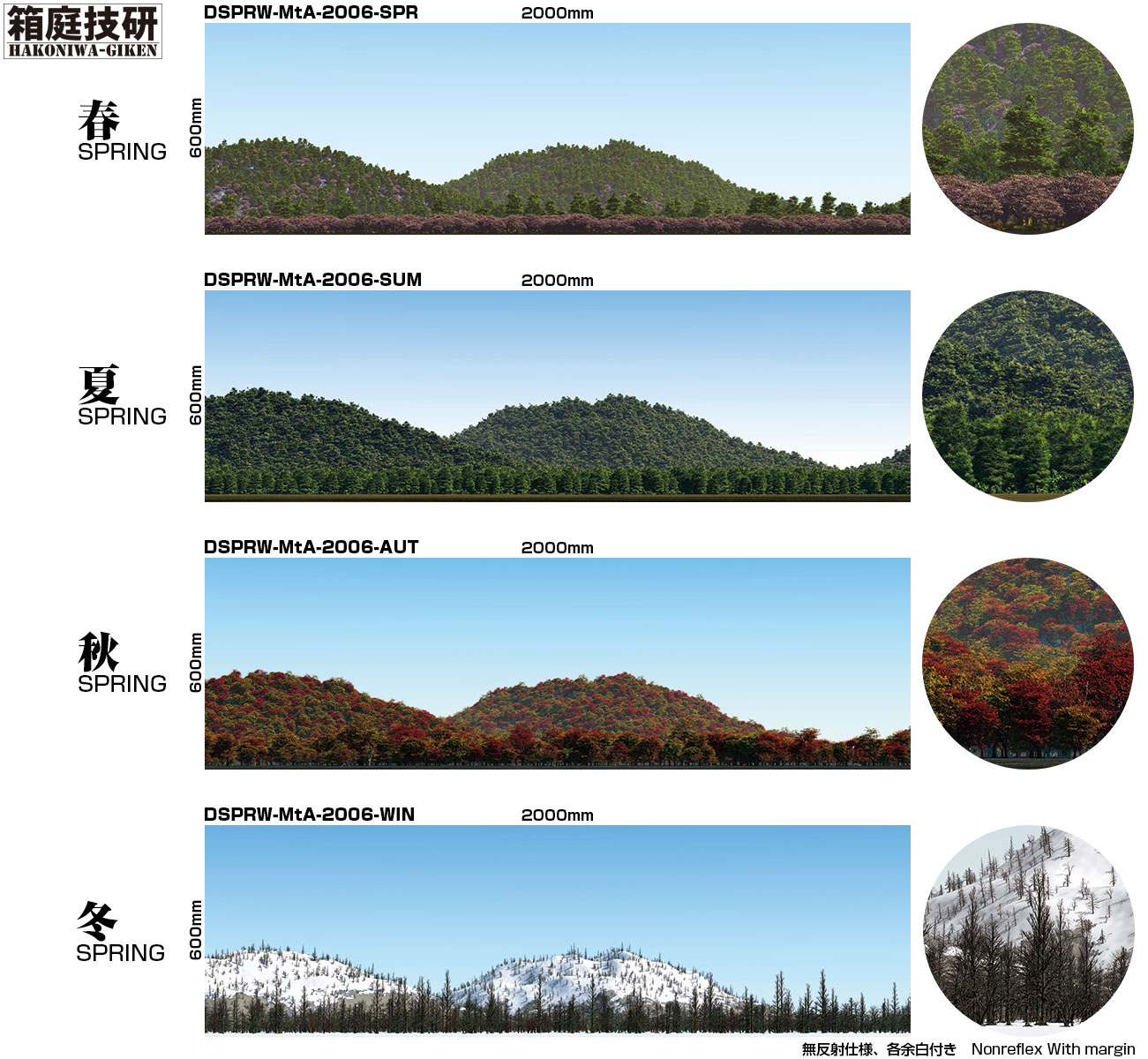 光の反射・テカりを極限まで抑えた無反射素材採用のジオラマシートPROシリーズ。鉄道模型用にとても好評だった山背景シリーズを繋ぎ目無しのジオラマシートPROシリーズでリリース致します。高精細印刷で、とっておきのジオラマレイアウトが実車のようにリアルな空間に変わります。素材は樹脂製の合成紙で耐水性がありますので、湿気による波状変形もほとんどありません。耐久性のある溶剤インクは紫外線にも強く、3年間の屋外使用環境下でも色あせや劣化に強い対候性を誇ります。(本シートの素材は無反射仕様のため特殊なインク受理層を有しますので、水のかかるような場所でのご使用は避けてください)シート端の保護並びに画鋲やテープでの固定用に周囲に余白がございます。