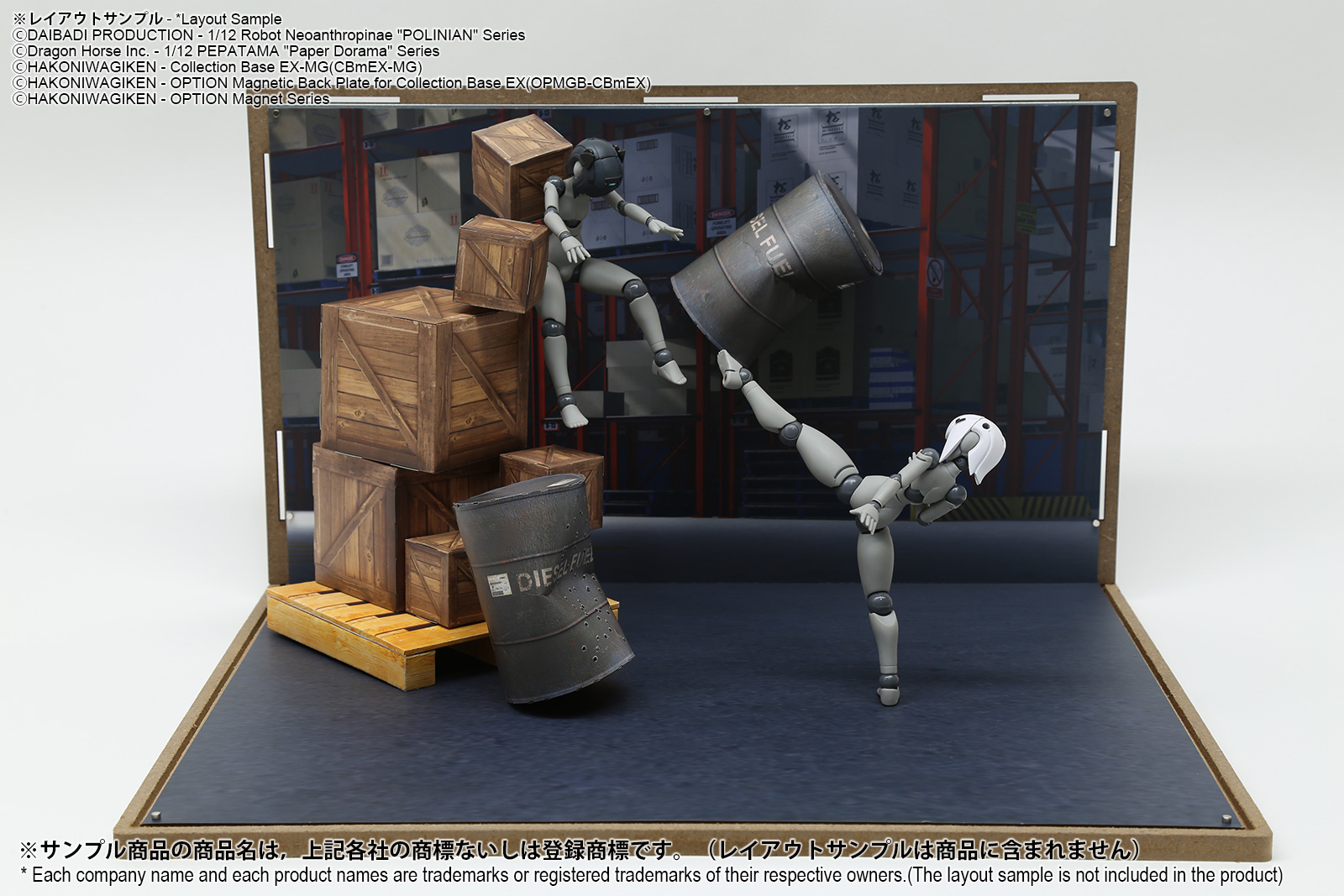 コレクションベースEXシリーズで利用可能なジオラマシートEXシリーズの倉庫セットAです。対応ベースは別売となります。マットPPコーティングで反射防止と耐久性を向上させたHGタイプの両面印刷1枚組で、2パターンが楽しめます。コレクションベースに設置して利用する際は、背景とベース部分の境界でカットしてご利用いただくと便利です。コレクションベースに付属の極小固定マグネットを利用して、簡単に設置が可能です。お気に入りのシーンが完成したら、別売のUVカットアクリルカバーで紫外線・ホコリから展示物を守る高機能なディスプレイケースへ発展可能です。 |