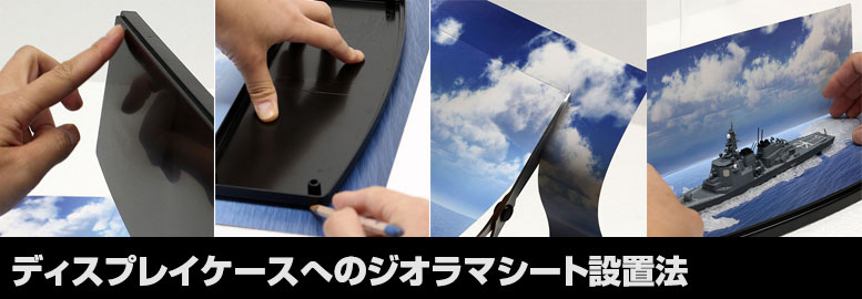 今回は艦船モデルを例に挙げてご紹介しましたが、ジオラマシートminiやジオラマシートを各種ディスプレイケースに設置する方法も基本的には同じです。小物などのアクセントを加えたり、背景部分の余りをケース内のサイドに貼り付けたりする方法も効果的ですので、思い思いのアイデアでご自慢のコレクション展示をお楽しみください。